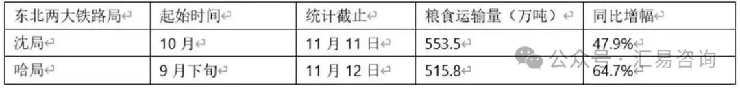 11月20日开始,全国各地铁路陆续发布停限装通知,主要波及哈尔滨、郑州、武汉、济南、上海、成都等多个铁路局集团的部分车站。虽然,停装时间通常在5天左右,但足可见今年铁路货运(尤其是北粮南运)的紧张程度。据业内统计显示,截至11月中旬东北两大主要铁路局(沈局和哈局)粮食运输量均较上年同期增加50%左右,参见下表。