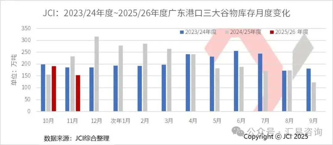 JCI跟踪统计,截止到11月中旬,以广东港口为代表的南方港口三大谷物(玉米、高粱和大麦)库存水平处于近三年偏低水平。同时,由于东北玉米尚未迎来第二轮(上冻后批量上市)上市小高峰,中国进口谷物到货有限,11月南方港口整体库存呈现环比进一步下滑的趋势,为国内玉米现货价格上涨提供了基础条件,也是一些农户和粮商看涨心理的来由,参见下图。
